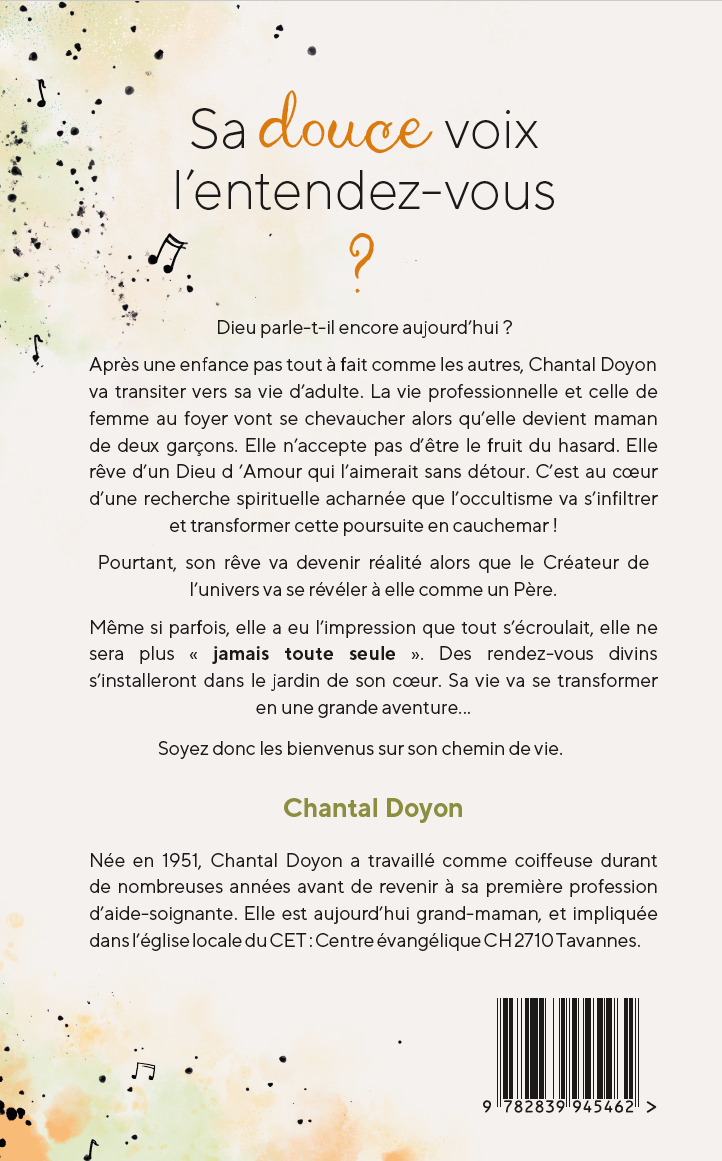 Après une enfance pas tout à fait comme les autres, Chantal Doyon va transiter vers sa vie d’adulte. La vie professionnelle et celle de femme au foyer vont se chevaucher alors qu’elle devient maman de deux garçons. Elle n’accepte pas d’être le fruit du hasard. Elle rêve d’un Dieu d ’Amour qui l’aimerait sans détours. C’est au cœur d’une recherche spirituelle acharnée que l’occultisme va s’infiltrer et transformer cette poursuite en cauchemar !